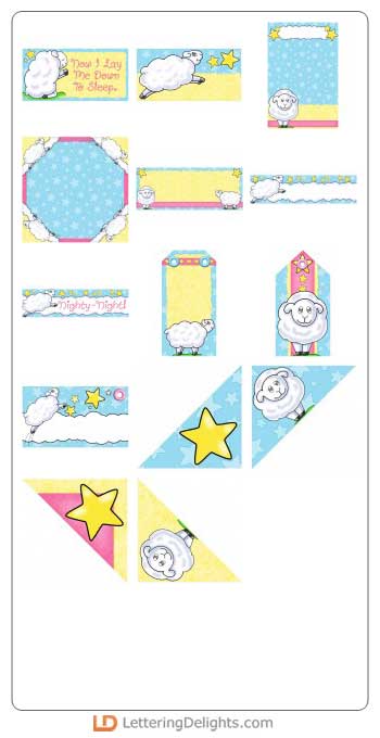 Don't be sheepish! Design lovable scrapbook pages with this collection of printable accents. It's perfect for baby layouts. Try it also for making baby announcements or congratulations greeting cards. Use the photo frame to showcase your favorite sleepy photograph, attach a few squares of adhesive-backed magnet tape, and you have an adorable kitchen magnet for yourself or grandma.