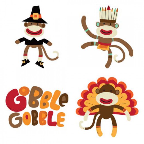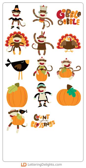 The sock monkeys star in a set for November. Dressed as pilgrims, Native Americans, turkeys, and playing with pumpkins they are ready to add to their stuffing!