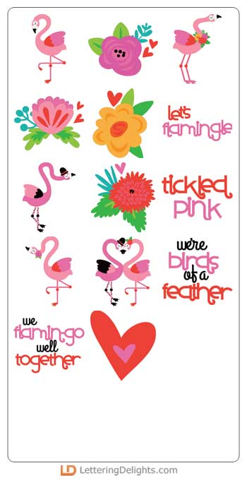 Let's "flamingle" includes plenty of flamingo and flower puns. This set works great for Valentines, love, and parties.