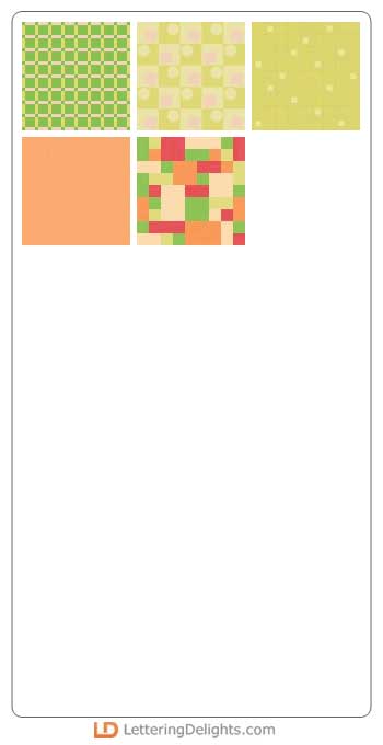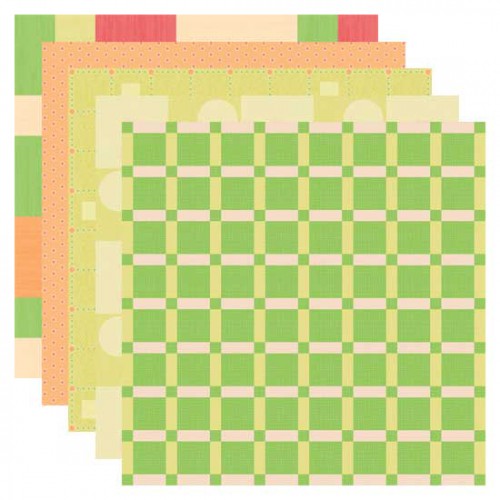 Geometric shapes and shades of green are the main look in this set of papers highlighted with orange, red and pink. Use them for fun, retro, bright, and fanciful digital scrapbook layouts.